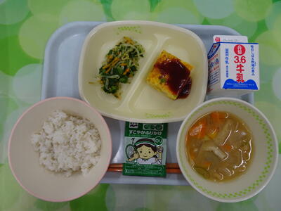 麦入りご飯・牛乳・カラフル卵焼き(ソース)