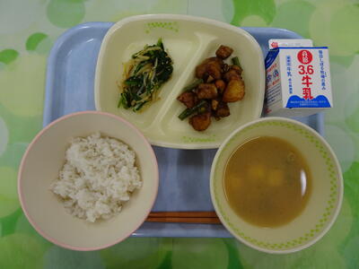 麦入りご飯・牛乳・フカとじゃが芋の揚げ煮