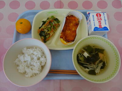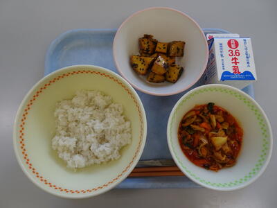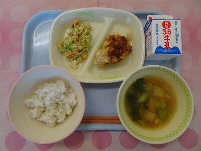 麦入りご飯・牛乳・ポテトの卵焼き(ソース)