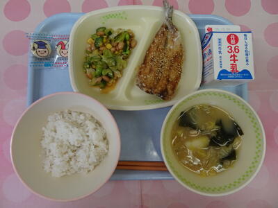 麦入りご飯・牛乳・虹鱒のもみじ焼き