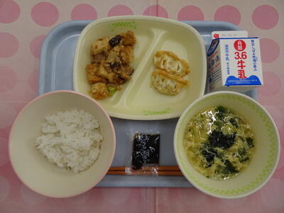 麦入りご飯・牛乳・タラのヤンニョムソースかけ