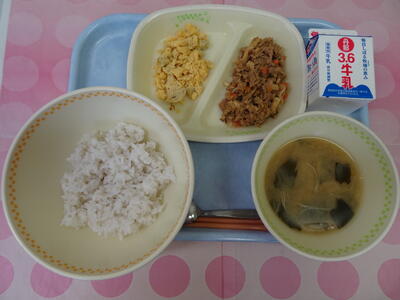 二色丼(ツナそぼろ・炒り卵)・みそ汁主な食材の産地