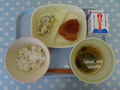 麦入りご飯・牛乳・ポテトの卵焼き(ソース)