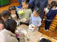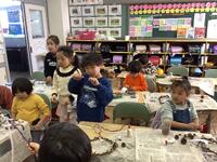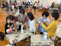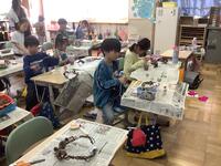 1年生図工の授業です。サツマイモのツルをまるめ、リースを作りました。どんぐりやモールなどで飾りづけをしてオリジナルな作品をつくることができました。