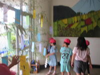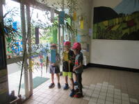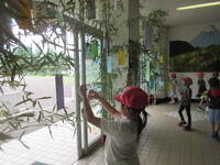 地域学校協働本部の方から竹をいただき、昇降口に飾っています。縦割り班ごとに分けて、願い事を書いた短冊をつけています。今朝、2年生が短冊と飾り付けをしました。少しずつ華やかになっています。
