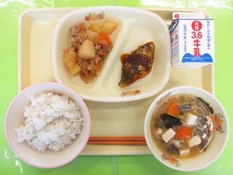 *牛乳*ご飯(有機米)*さばの塩麹焼き*生揚げの五目煮*沢煮椀