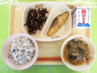 *牛乳*麦入りご飯*さわらの紅葉焼き*ひじきの炒め煮*みそ汁