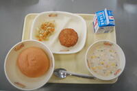 *ぎゅうにゅう *チキンバーガー(げんまいいりパン・チキン) *キャベツソテー *ポテトスープ