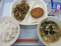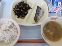 *ぎゅうにゅう *むぎいりごはん *さわらのしおこうじづけ *ひじきのいために *ぐだくさんじる