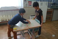 5年生図画工作科「糸のこスイスイ」の学習の様子です。これまでに糸のこを使って、パーツごとに切って、色塗りをして、ニスを塗りました。今回の授業では、そのパーツを組み立てていきます。自分のイメージ通りに組み立てていくことができる子や少しイメージと違いますが、新たなイメージが生まれた子など、どの子もパーツを一生懸命に組み立てていきました。