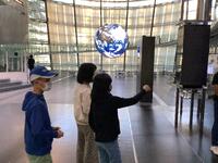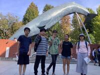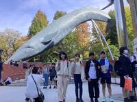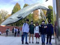 子供たちは、たくさんの展示物に興味津々。名物のクジラの前で記念撮影です。