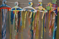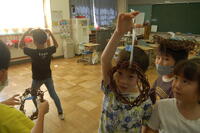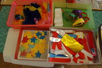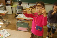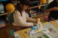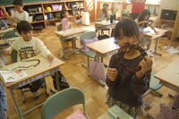 1年生図画工作科の授業の様子です。かぜにひらひらゆれるかざりを作りました。ハンガーの形をした紙にいろいろな飾りをつけていきます。折り紙や星形の画用紙、スズランテープなど自分のイメージをふくらめながらステキな作品に仕上げました。