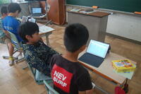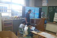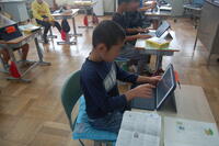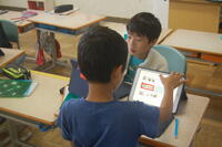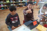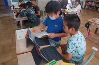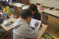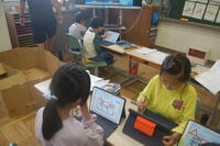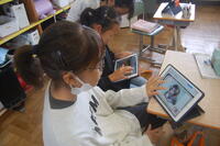 1年生が国語科「さるじぞう」の学習の様子です。タブレット型端末を活用して、行いました。じさま役の子、さる役の子に分かれて、セリフの部分に色をつけて行いました。お互いに自分の役のセリフを友達同士で確認しながらやっている姿が、とてもかわいらしかったです。