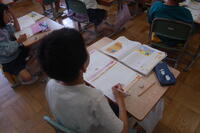 1年生漢字の学習の様子です。漢字の練習を少しずつしています。今日の漢字は「出る」「小さい」「音」「花」「犬」の5文字を書きました。一画一画書き順を確認しながら書きました。漢字ノートにも丁寧に書き、お家での宿題になります。