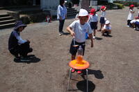 プログラム3は、3・4年生の変化走「WBC in坂小ラウンド ~世界一の熱狂をもう一度~」です。最初にカードをとります。カードに書いてあるボールを棒を使ってゴールに入れます。平均台を渡って、最後の見せ場、フラフープです。ペッパーミルのように動きで華麗にフープを回します。1番でゴールした子には、兜のご褒美がありました。兜をかぶらせてもらい、嬉しそうでした。