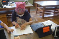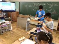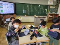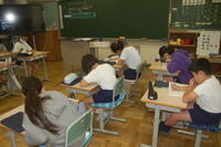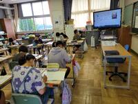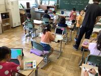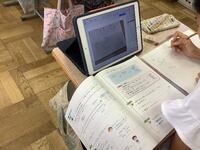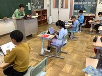 5年生は、「わり算」の筆算の方法について、一人一人がまとめていました。習得したことを活用して自分の言葉でまとめる取組は、学習内容の定着を図るために有効です。子供たちは、熱心に取り組んでいました。そして、自分でまとめた内容をタブレット型端末で撮影し、Meta Mojiにアップロードしていました。それをクラス内で共有することで協働的な学びとなりました。友達がまとめたものと自分のものを比較したり、友達のまとめの「よさ」を取り入れたりすることで、さらに学習の定着を図ることができるとともに、次の学習や取組に生かすことができます。
