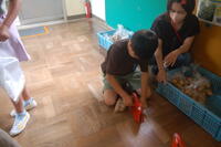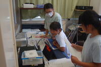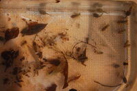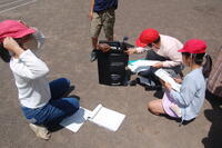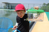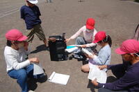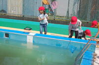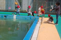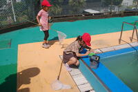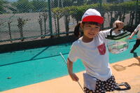 1年生が昨日に引き続き、生き物探しをしました。今日は、学校のプールの中の生き物を探しました。タモや虫かごを持ってプールに行きました。プールには、オタマジャクシがいました。また、プールの底をたもですくうとヤゴも捕れました。たくさんのオタマジャクシとヤゴを捕まえることができ、とても嬉しそうでした。