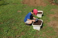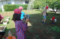 1年生が、アサガオの種まきをしました。自分の鉢に土を入れたあと、種をまく前に十分、土に水をまきます。十分水をまいた後、種まきをしました。種は全部で5粒まきました。早く芽が出てほしいとばかりに水をたくさんまいていました。