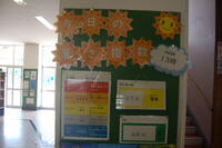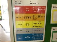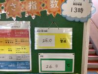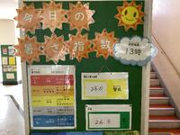 暑さ指数に皆が着目できるように工夫されています。子供たちも教職員も、この掲示を頼りにして活動しています。養護教諭は、暑さ指数(WBGT)計を用いて、一日に数回測定し、子供たちと教職員の「安全・安心」を守っています。