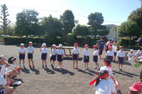 プログラム2は、応援合戦です。赤組、白組に分かれて行います。6年生の応援団は、赤、白の法被を着て、かっこいい姿でした。団長のかけ声に合わせて、どの子も、元気よく声を出したり、拳を突き上げたり、手拍子をしたりしていました。赤組、白組のどちらもかけ声が工夫された応援でした。これから始まる競技に向け、全員に気合いが入りました。