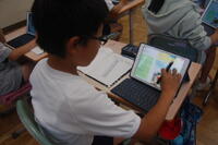 国語の教材「東京スカイツリーのひみつ」を扱い「要旨」をとらえて読む力を培う学習を行っています。今日は、前の時間に学習した「要旨」とは何か、「要旨」を捉えるためのポイントなどを生かして、タブレット型端末にあるMeta Mojiを使って要旨をまとめていました。担任は、前の時間に学習したことを振り返りながら学習できるように、前時の黒板画像を画面上で見られる工夫をしていました。また、より「要旨」をとらえてまとめるといった意識を高めるために「100~150字でまとめる」といった条件を付けていました。子供たちは、皆集中して取り組んでいました。やることが明確であったり困ったときのヒントがあったりすると、子供の学ぶ意欲が高まります。タブレット型端末を使った利点は、書き込むときに間違いを訂正しやすいこと、友達との共有がしやすく自分の考えとの比較ができること、電子黒板にモニタリングすると一人一人の学習の様子がすぐわかることなどがあげられます。