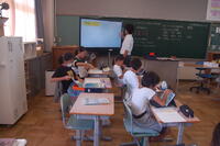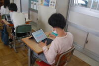 3年生理科の授業の様子です。「植物を育てよう」の学習で、4月に「ひまわり」「オクラ」「キュウリ」「トマト」「ピーマン」の種を蒔いたので、その芽が出てきました。小さい芽が出ていることが嬉しく、タブレット型端末で記録写真を撮っていました。これから生長していく様子を記録していくのが楽しみです。一人一人が生長記録として、デジタル画像を保存できるのも「タブレット型端末」の「よさ」です。