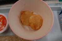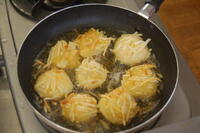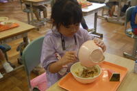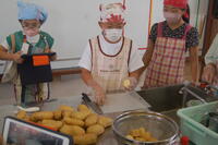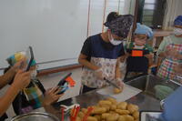 ゆでたジャガイモをつぶし、コロッケの形に丸めました。丸めたジャガイモにスライスしたジャガイモをつけて、油で揚げました。コロッケを揚げるのは、栄養士さんや支援員さんに手伝っていただきました。きつね色やきれいにコロッケが揚がっていきました。揚げたてのコロッケにお塩を少しふり、紙袋に入れて完成です。
