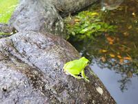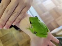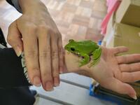 坂小学校の池で「モリアオガエル」が繁殖しています。木の枝に産み付けた卵からかえったおたまじゃくしが池に落ち、現在たくさんのおたまじゃくしが泳いでいます。先日、おたまじゃくしから変態し成体となった「モリアオガエル」を見つけました。坂小学校の池はビオトープとなり生態系が維持されています。