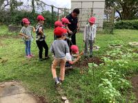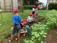3年生が雨間に、特別教室棟南側にある学年菜園(畑)に行き、ナスなどの野菜の生長を確かめました。そして、今後の生長を想定し、苗を支える棒を添える活動に取り組みました。一人一人が生長を願って、優しい気持ちで苗と棒を結んでいました。