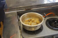 5年生が家庭科の時間にさかじゃがを使って、坂コロッケを作りました。作り方などは事前に調べ学習を行い、イメージトレーニングはバッチリでした。最初にジャガイモを切ってゆでました。
