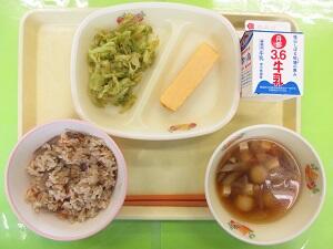 *牛乳*五目炊き込みご飯*たまご焼き*キャベツのカレーソテー*白玉団子汁