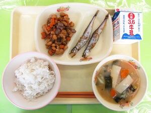 *牛乳*麦入りご飯*ししゃものごま焼き*五目煮豆*みそワンタンスープ