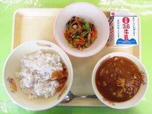 *牛乳*麦入ごはん*カレー*洋風ごま和え*福神漬け