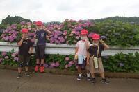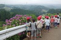 坂小学校の近くには、あじさいロードがあります。白色、紫色、赤色、ピンク色、青紫色など色とりどりのあじさいが、とてもきれいに咲いています。「僕は白色が好き」「私は、青紫色が好き」「赤色のあじさいもかっこいいな」「このあじさい、先生の顔よりも大きい」など、たくさんの種類のあじさいに子どもたちは、大喜びでした。
