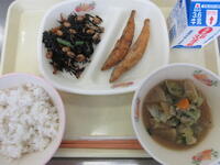 *ぎゅうにゅう *むぎいりごはん *ししゃものたつたあげ *ひじきのいために *キャべとんじる
