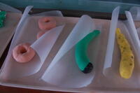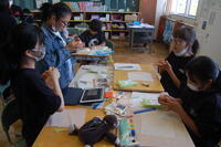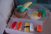 6年生が図画工作の授業で粘土を使って、食品サンプルを作りました。まずは、自分が作りたいもののイメージ図を描きました。白い粘土に色を混ぜて自分の作りたい食品サンプルの色粘土を作りました。おすし、ドーナツ、バナナ、目玉焼き、ピザなどオリジナルの作品を上手に仕上げていました。