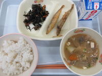 *ぎゅうにゅう *むぎいりごはん *ししゃものたつたあげ *ひじきのいために *とんじる
