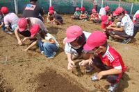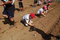 慣れていない1年生・2年生は、5・6年生のお兄さん・お姉さんがペアとなって3つずつ協力しながら、一緒に種をまきました。5・6年生が種を手渡しながら、優しく植える手伝いをしていました。さすが5・6年生です。お兄さん・お姉さんが優しく教えてくれるので、1年生や2年生も嬉しそうでした。