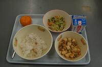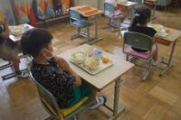 夏休み明け最初のメニューは、ごはん、マーボードウフ、ジャガイモの中華サラダ、冷凍ミカン、牛乳です。配膳が終わり、みんなで「いただきます」のあいさつをしました。黙食で、まだまだ新型コロナ感染症対策をしながらですが、どの子も久しぶりの給食にうれしそうでした。