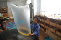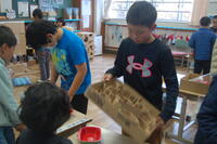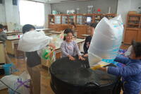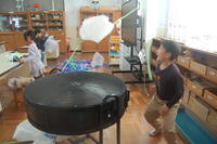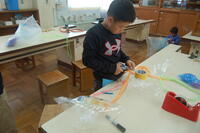 3年生図画工作の授業の様子です。袋に絵を描いたり、紙テープなどをつけたりしたものを、送風機を使って浮かび上がらせます。高く飛んだり、風に揺られたりしている様子がとてもおもしろかったです。