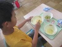 本日の給食は、セルフオムライス!エビピラフの上に卵焼きが乗っています。その卵焼きを自分の思いのままに包みます。うまくピラフを包む子、そのままダイナミックに乗せたまま食べる子、それぞれ食べ方はいろいろでしたが、楽しみながら食事をすることができ、こどもたちからは「おいしい」「オムライス大好き」などの笑顔をたくさん見ることができました。