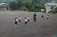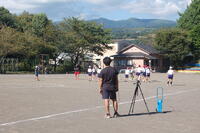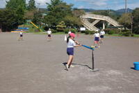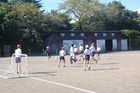 5年生体育「ティーボール」の授業の様子です。これまでに、ボールを取る練習や打つ練習を行ってきました。2チームに分かれてゲームを行い、ルールなども話し合ってきました。ゲームの時のコートの形も変えて行っています。攻撃では、全員が打って、入った得点を数えること、守備ではボールを取った人のところに全員が集まったり、フラフープを持っている人とボールを取った人が集まったりとルールを工夫していました。