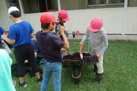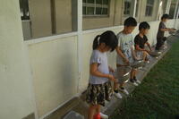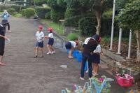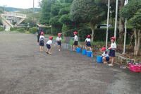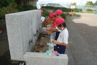 4日(月)に、1年生の生活科「水とあそぼう」の授業の様子です。子どもたちはそれぞれ、水鉄砲を使って遊びました。自分の水鉄砲を持っている子は、自分の水鉄砲を使いました。バケツや水道から水鉄砲に水を入れ、運動場に向けて発射したり、友だちや先生に発射したりしていました。最後は、しっかりと足を洗ったり、タオルで拭いたりして着替えました。子どもたちは、とても楽しく水と遊びました。