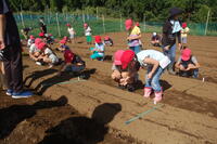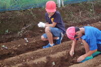 11日の月曜日と12日の火曜日に大根の種まきを行いました。地域学校協働本部の方々に協力していただきながら種まきをしました。一人の分担は10穴です。1つの穴には、3つずつ種をまきます。なので、一人あたり30粒の種をまきました。初めての1年生は、6年生のお兄さん・お姉さんがペアとなって、一緒に種をまきました。さすが6年生です。お兄さん・お姉さんが優しく教えてくれるので、1年生も嬉しそうでした。