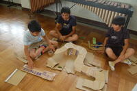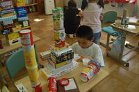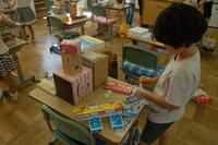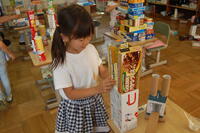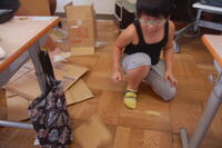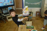 1年生、図画工作科「はこでつくったよ」と算数の「かたち(1)」を合わせた授業の様子です。箱の形の特長を生かして、自分のイメージを膨らませながら作品を作っていました。わに、パンダ、うさぎ、犬、ねこなどの動物や東京タワー、東京スカイツリーなどの建物など工夫しながら作ることができました。