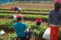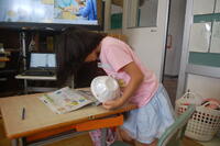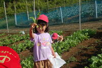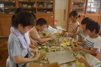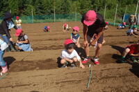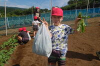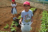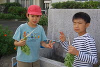 1年生と6年生でペアになって行いました。6年生が丁寧に1年生にやり方を教えていました。3つの苗から1番元気な苗だけを残し、後は間引きをしました。間引いた芽は、袋に入れてお家に持って帰り、お家で食べます。初めての間引きを体験した1年生は、袋一杯になりとてもうれしそうでした。