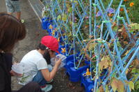 5年生理科「花から実へ」の学習の様子です。育てているヘチマに花が咲いて実ができています。実がどのようにしてできるのか考えるのは、まず、ヘチマの花や花壇に咲いている花の作りについて調べることになりました。花の作りの中で、おしべとめしべがあることに気づきました。これから、おしべとめしべの関係について調べていくのが楽しみです。