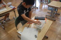 1年生が学校の運動場や坂っ子山、坂っ子広場、畑で生き物や植物さがしをしました。生き物では、ダンゴムシやバッタを見つけたり、植物では、きのこやヘチマを見つけたりと学校の周りにはたくさんの生き物や植物を見つけました。教室に戻って、見つけたよカードに自分のお気に入りをかきました。見つけた場所、見た目、手ざわりなど虫めがねや自分の目、手で確かめながら丁寧にかいていました。