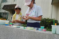 5年生図画工作「水から発見 ここきれい!」の授業の様子です。絵の具を使って、水の色を変えてみました。赤や緑、青などの色を作り、その後、色の組み合わせを試してみました。自分の気に入る色ができるまで、たくさんの色水を作って楽しみました。