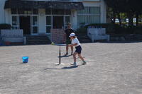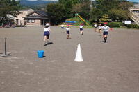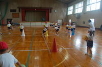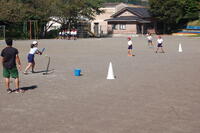 1,2年生が体育の授業でボール投げをしました。ペアになって活動しました。高く投げてみたり、バウンドさせてみたりといろいろな投げ方をやりました。最後に、カラーコーンを的にして投げる練習をしました。カラーコーンを置く場所は、レベル1からレベル4に分けて、長さを変えてやりました。レベル1は、1ポイントでレベル4は、4ポイント得点が入ります。ゲーム感覚で楽しみながら投げる力を育みました。